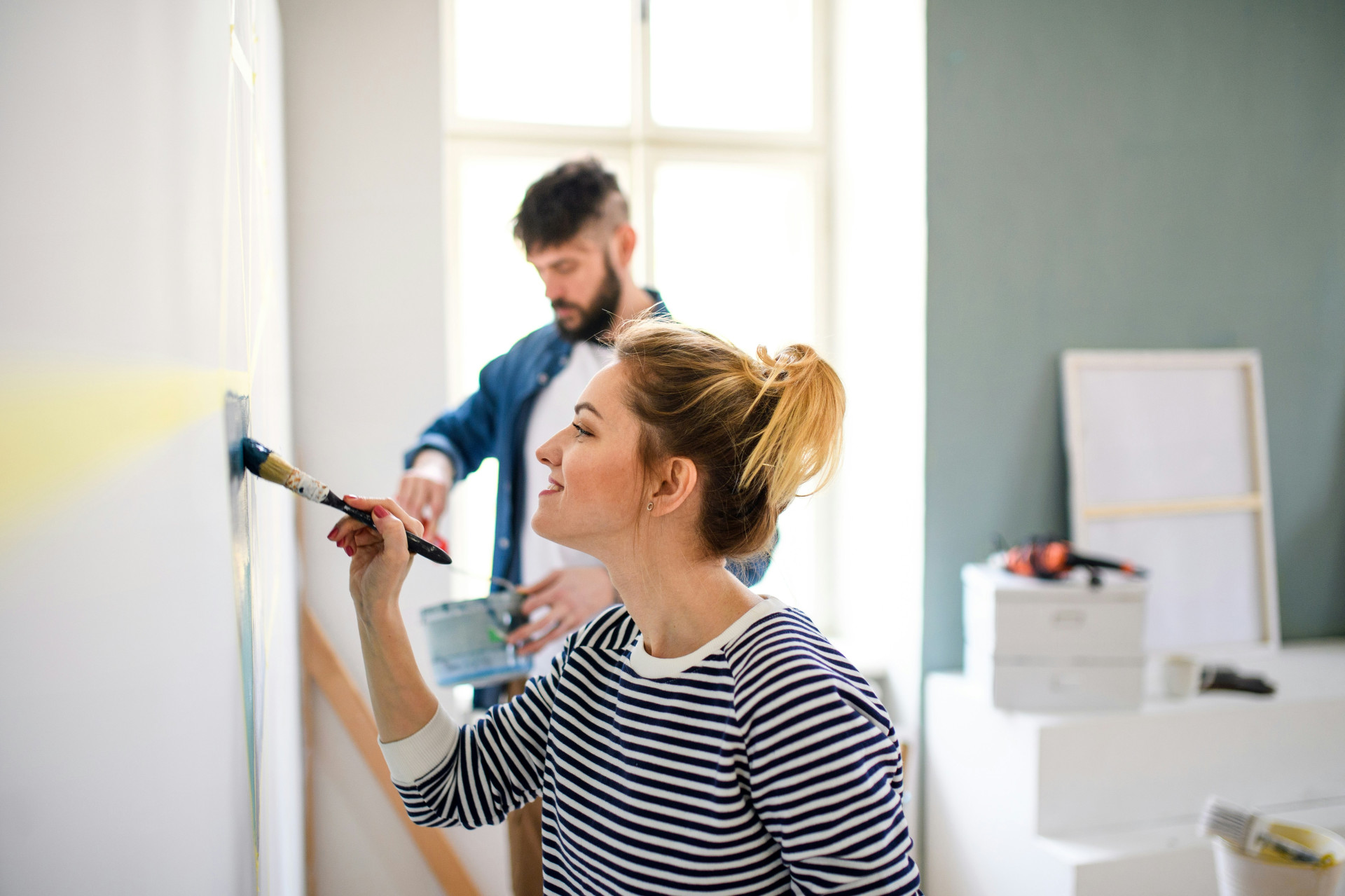 Täck intilliggande ytor med maskeringstejp, men undvik att skapa skarpa kanter mitt på väggen. En mjuk övergång ger ett mer naturligt resultat.